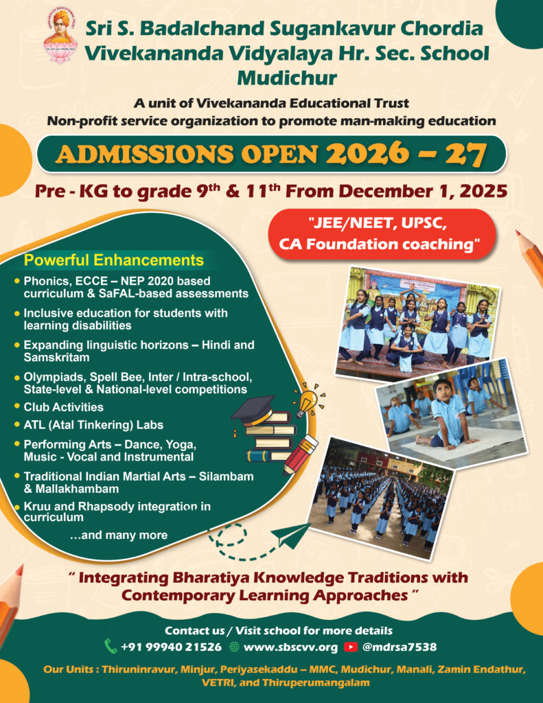 Mother of R.G. Sujitt Grade 9 and R.G. MouhittI am truly grateful for the exceptional education my sons are receiving at Sri S. Badalchand Sugan Kavur Chordia Vivekananda Educational Trust, Mudichur. My eldest son, now in Grade 9, has imbibed invaluable lessons in discipline, punctuality, values, and respect under the guidance of skilled and dedicated mentors.